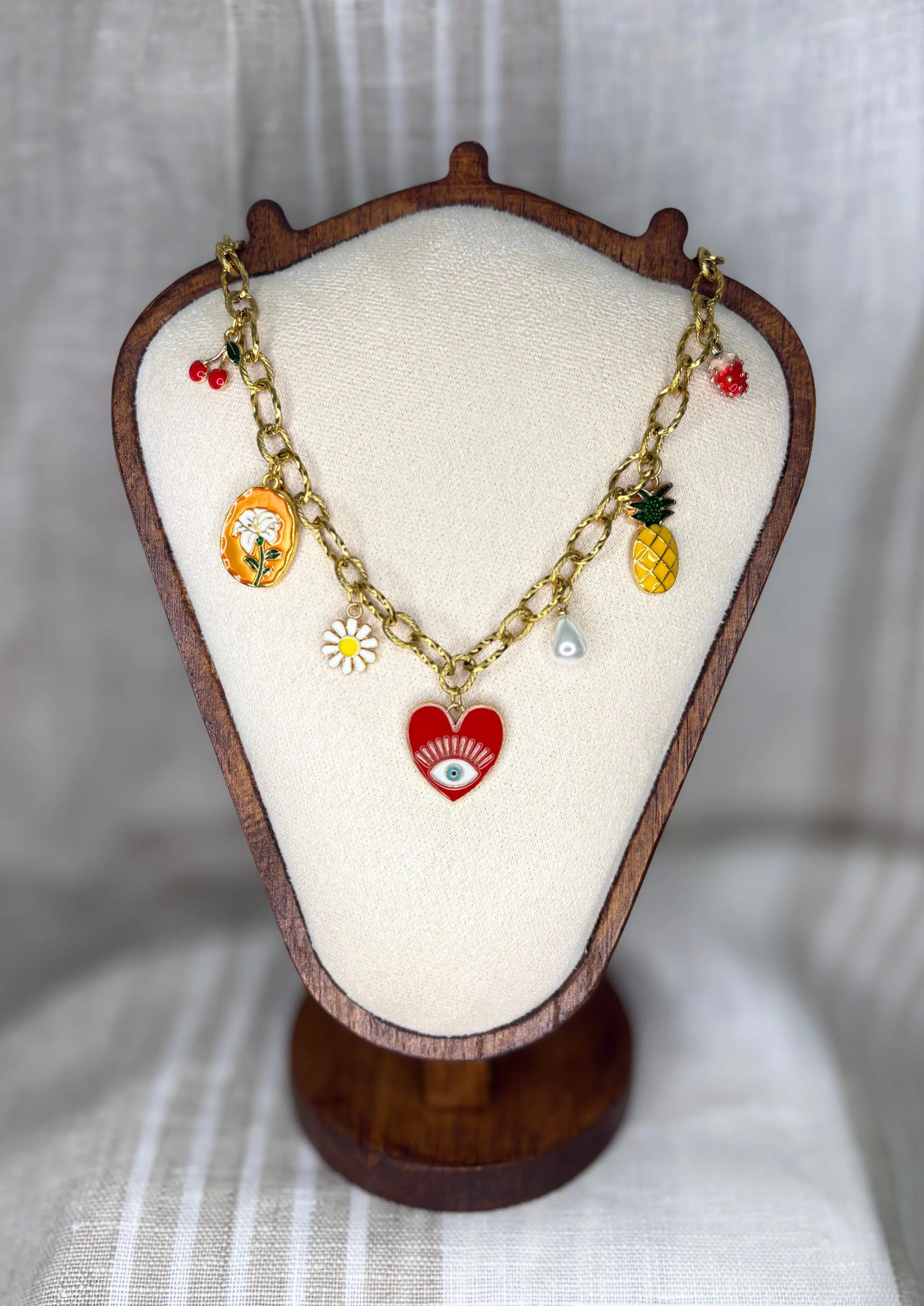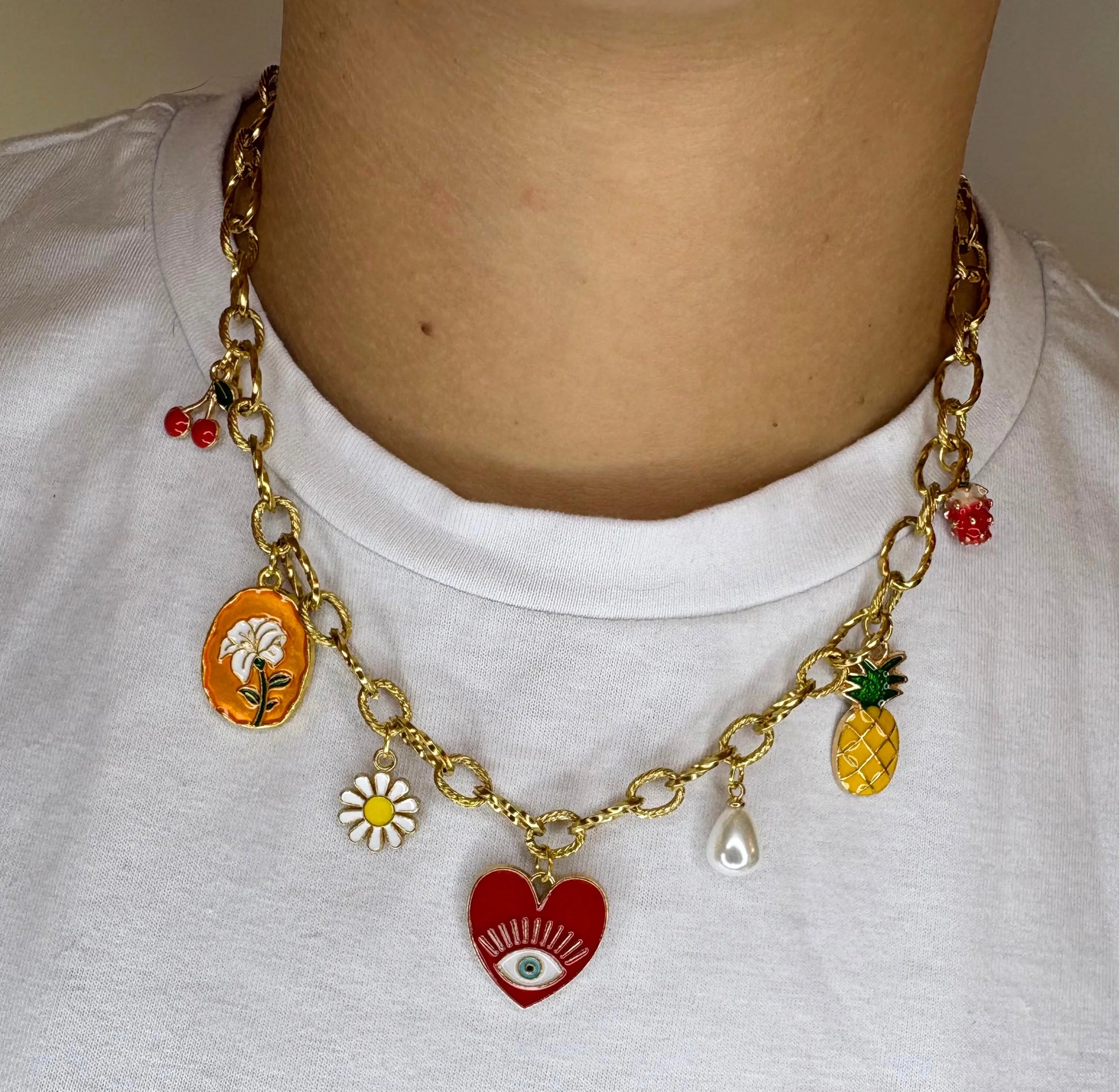 ✨ Le collier “Agathe” est une déclaration d’amour à la fantaisie, un bijou espiègle et solaire qui semble sorti d’un rêve d’été éternel. Avec ses breloques hautes en couleur et sa chaîne dorée aux reflets chauds, il incarne l’audace joyeuse, la tendresse sucrée et une touche de mystère.