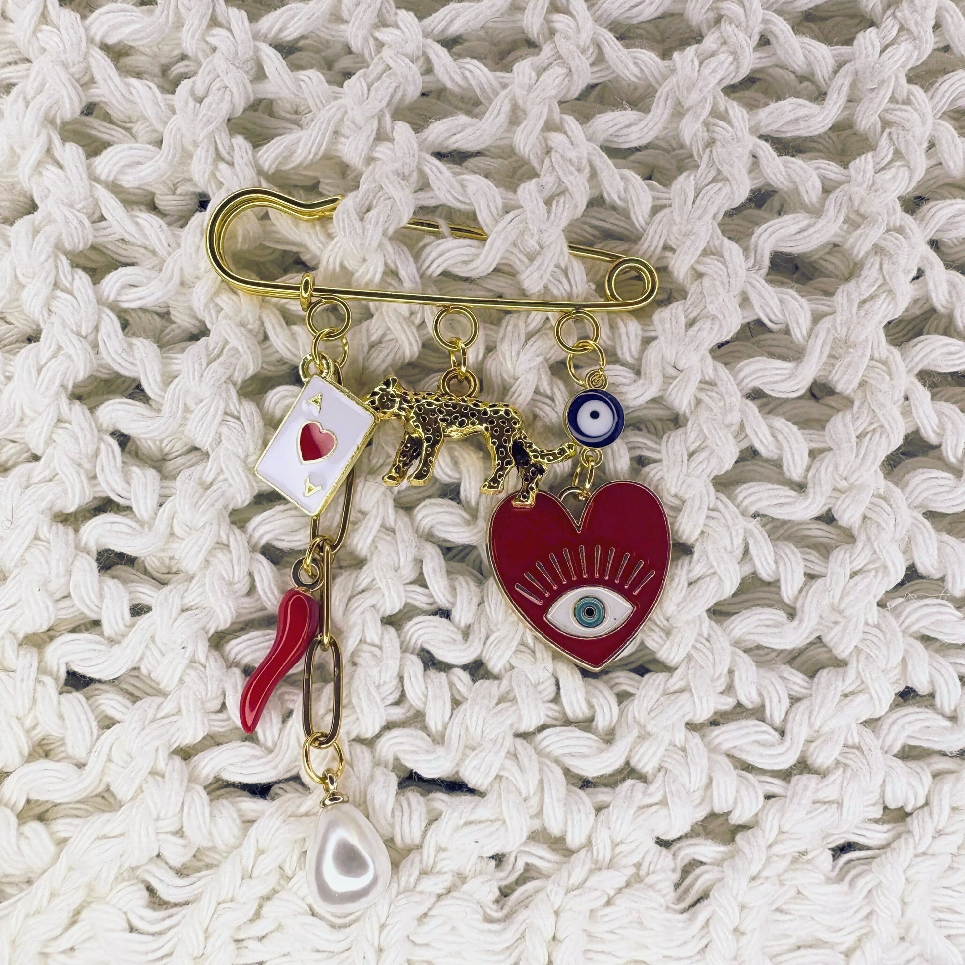 Accrochée à un manteau, une veste ou un sac, cette broche raconte une histoire vibrante et protectrice :