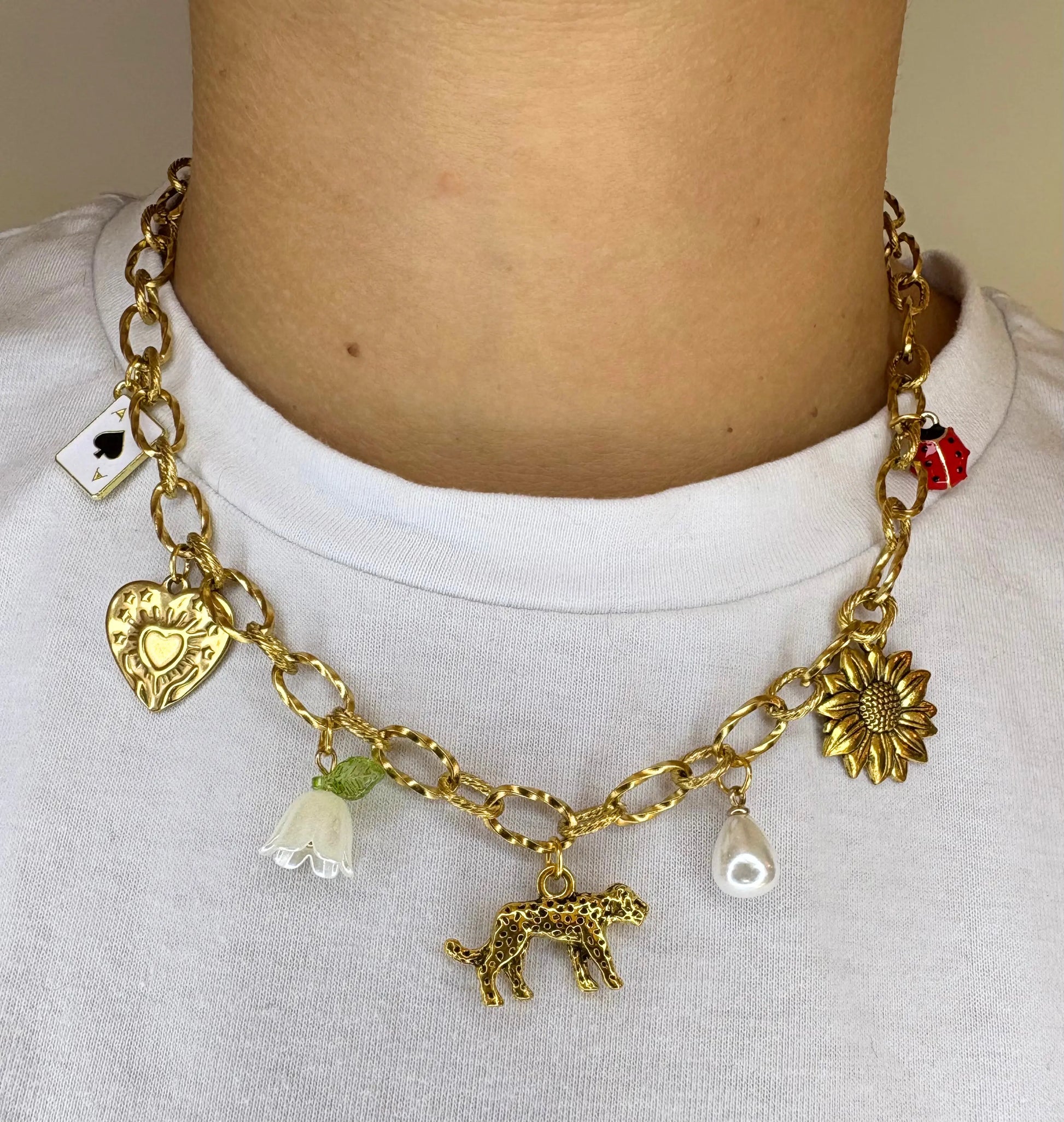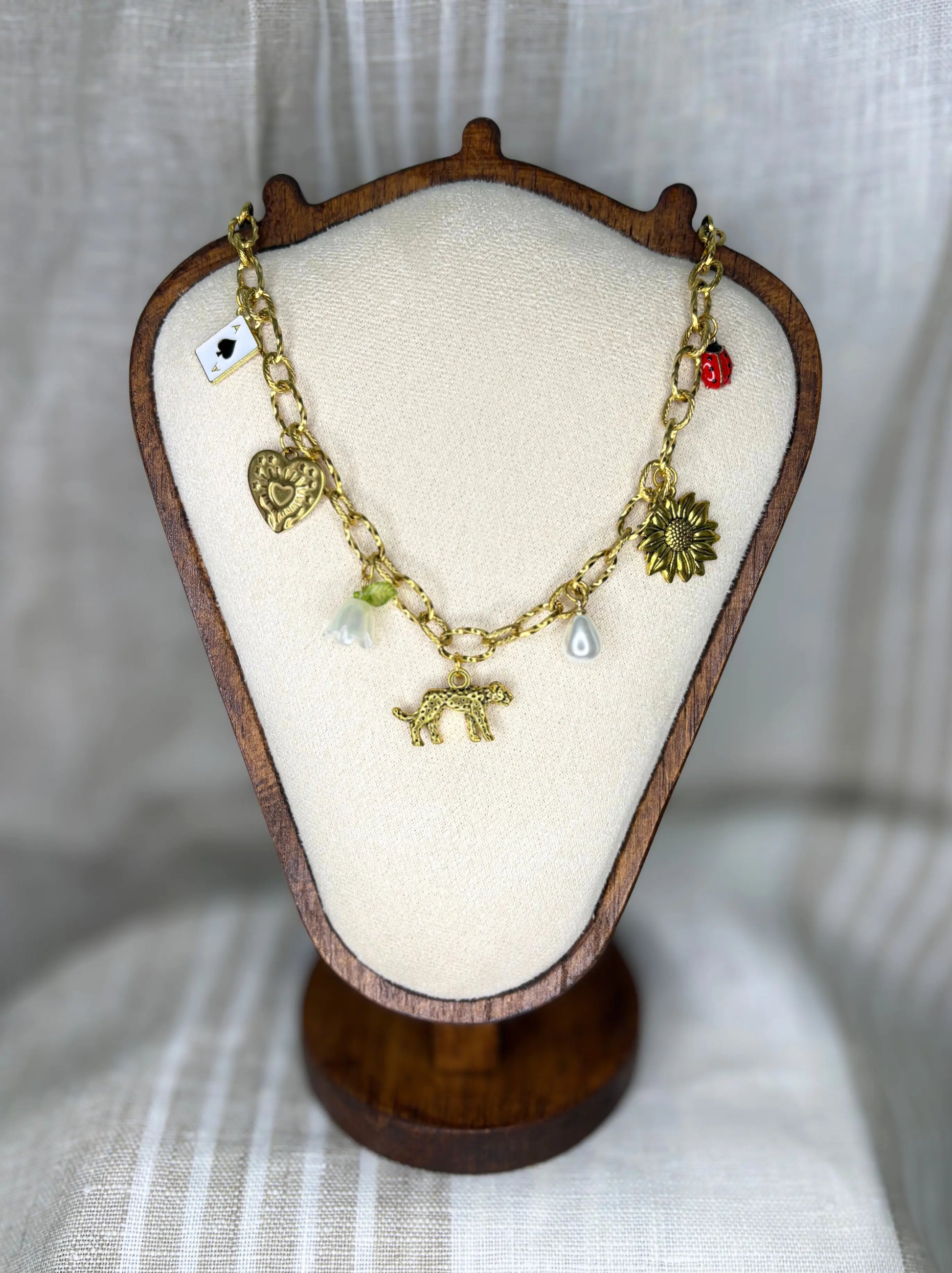 ✨ Le collier “Sarah” est un bijou plein de poésie, comme un souvenir doux d’enfance qu’on garde tout près du cœur. Doré comme les rayons d’un soleil d’été, il est orné de petites breloques magiques, chacune semblant raconter une histoire — un peu comme celles que l’on inventait avec sa meilleure amie en jouant dehors jusqu’au coucher du soleil.