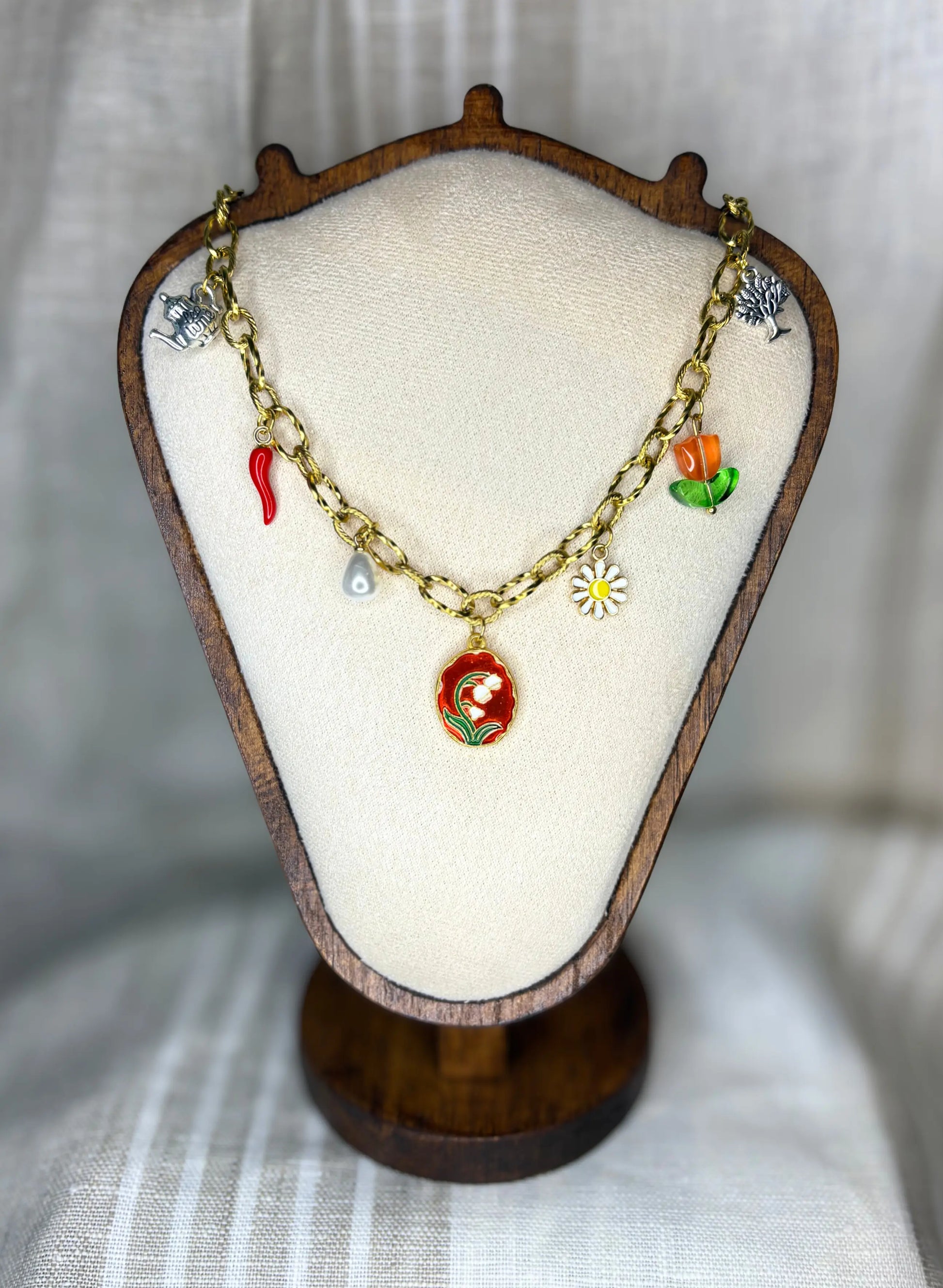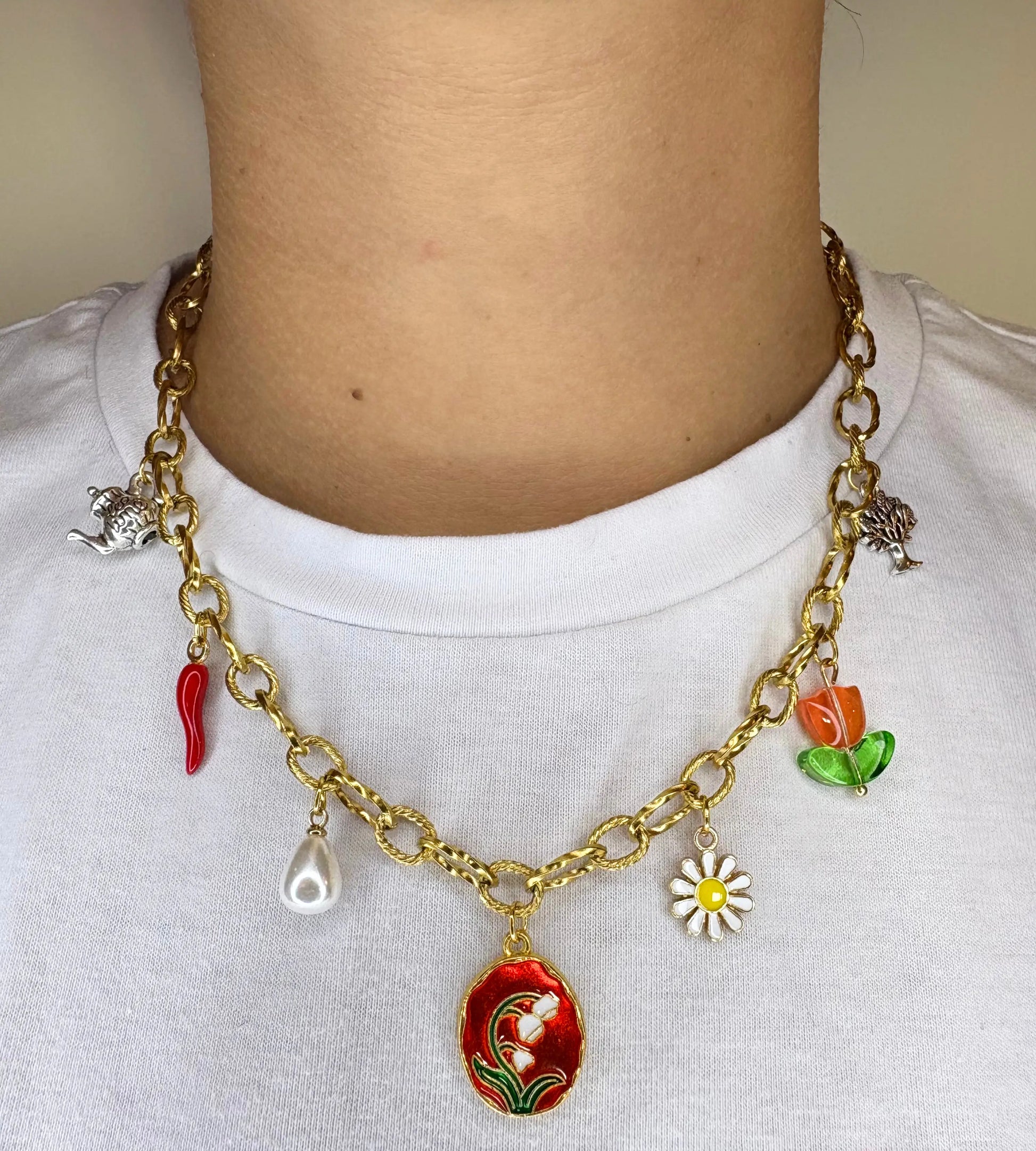 ✨ Le collier “Joëlle” est une promenade enchantée à travers un jardin secret, un bijou espiègle et poétique, comme un trésor ramené d’un rêve coloré. Sa chaîne dorée, aux maillons texturés, capte la lumière comme les souvenirs captent le cœur. Chaque breloque est une petite histoire, un clin d'œil à la nature, à la fantaisie, et à la douceur de vivre.