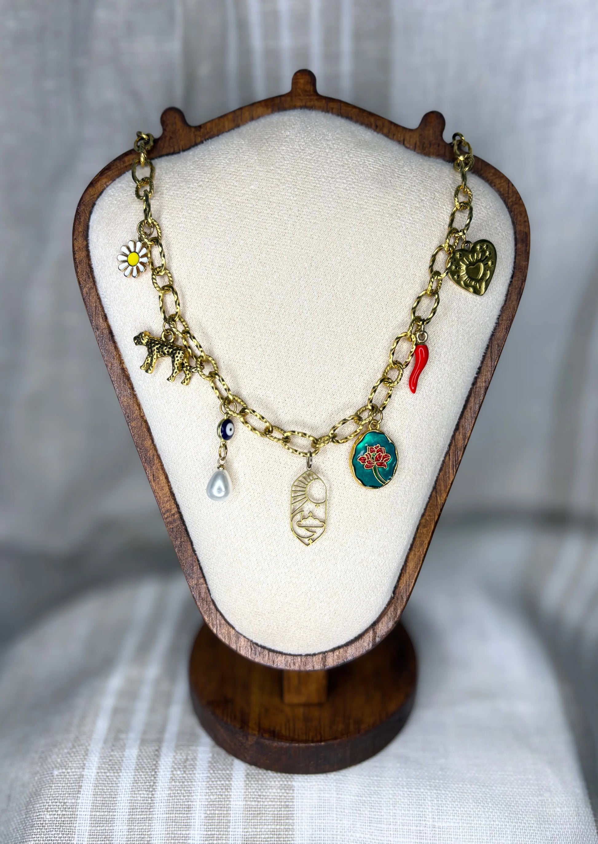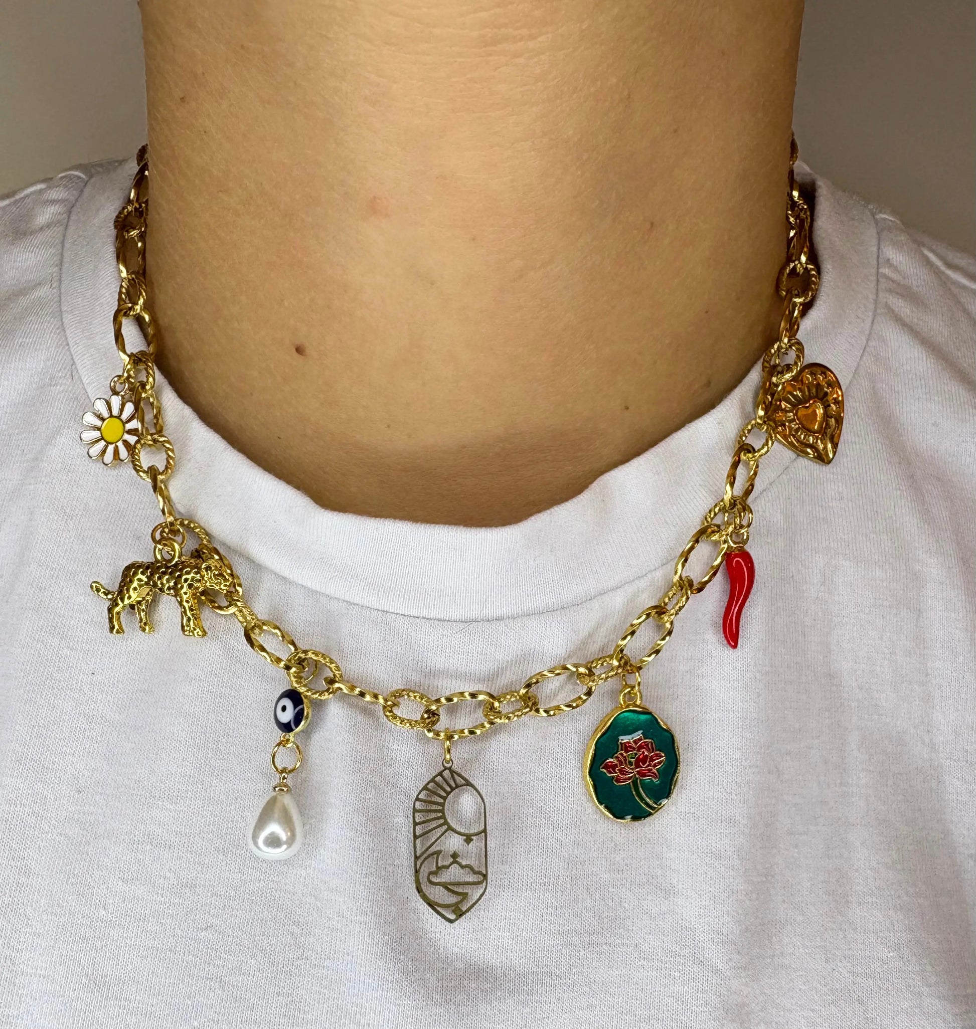 ✨ Le collier “Pauline” est une véritable déclaration de style, un bijou plein de caractère où chaque breloque semble porter en elle une petite histoire à raconter. Doré et lumineux, il joue entre force et douceur, couleurs et symboles, pour créer un univers unique, vibrant et poétique.